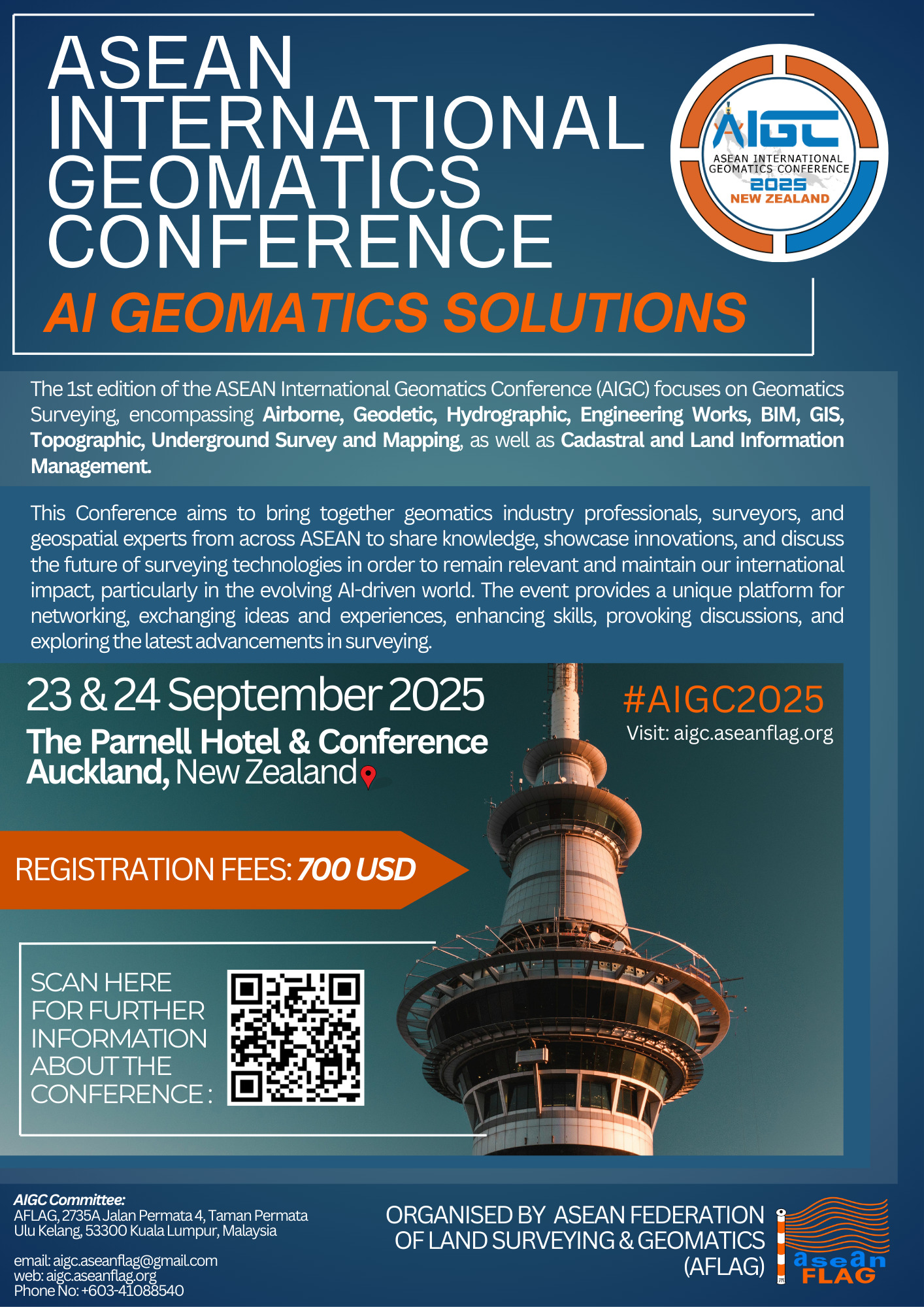 Warm greetings from the ASEAN International Geomatics Conference (AIGC) Committee and the ASEAN Federation of Land Surveying and Geomatics (AFLAG). With less than 75 days to go, we are delighted to announce that AFLAG is organising the ASEAN International Geomatics Conference (AIGC) with the theme "AI Geomatics Solutions." The details of the conference are as